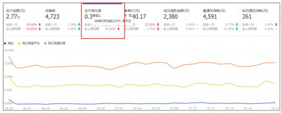 打开生意参谋,在首页就可以看到你的综合支付转化率跟同行同层均值对比的情况,一般情况(我这里为什么说一般情况,因为还有特殊的),如果你的这个综合支付转化率远低于行业均值的话,都意味着你在消化流量的能力上是不行的,显而易见的,搜索引擎就会减少对你免费自然搜索流量的扶植。