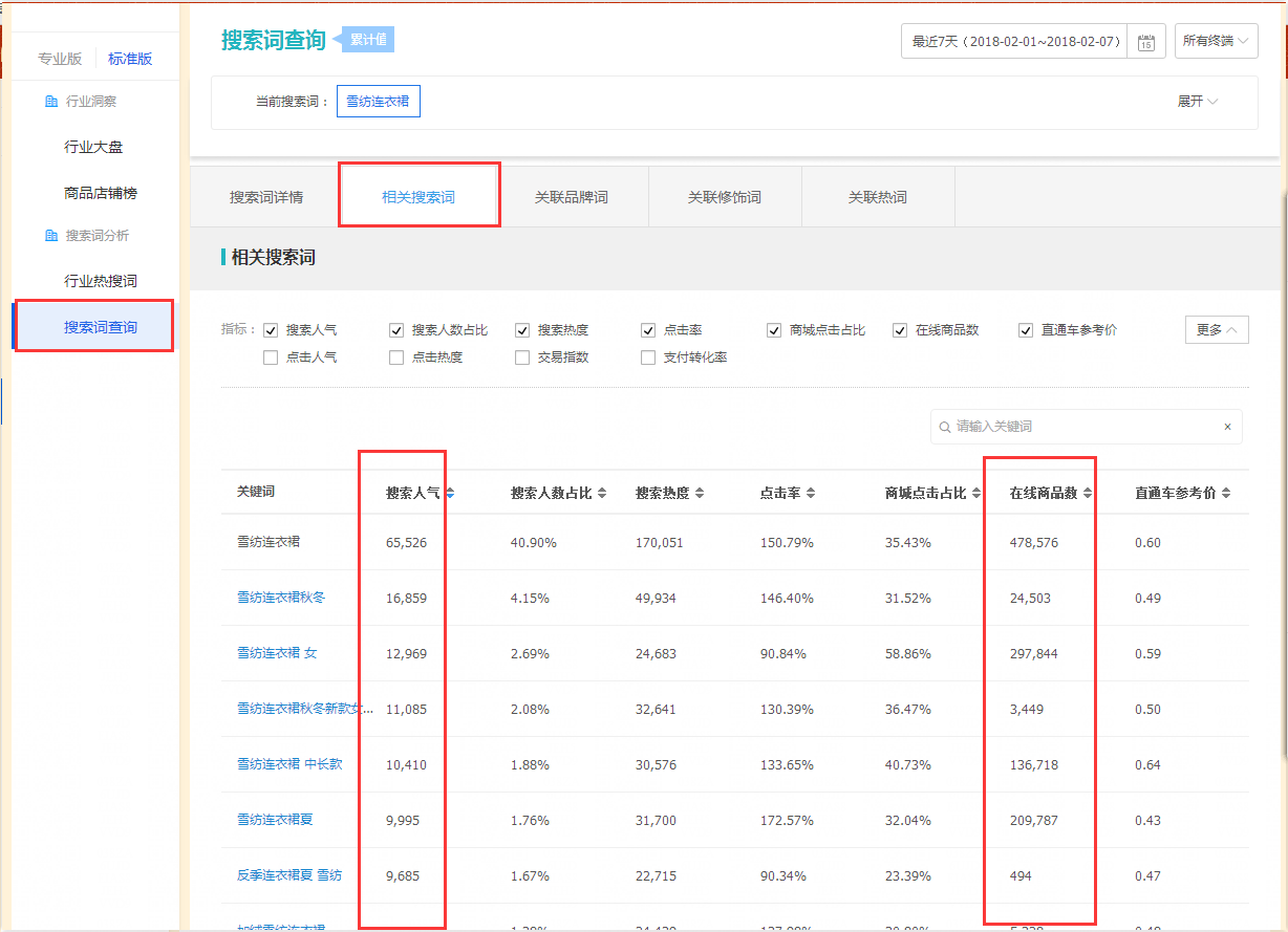 分析行业热词数据,确定宝贝的核心关键词。所谓核心关键词,就是最能区分你宝贝与同行宝贝之间的区别的关键词。一般为产品的材质,功能卖点等。例如该款产品,结合产品与数据,我们将核心关键词选定为“雪纺连衣裙”。核心关键词注意不要选择搜索量过于小的,这样可能导致你后期拓展数据量太小进行不下去。也不要选择最大的热词,比如连衣裙这个词,否则拓展的数据精准度不够。