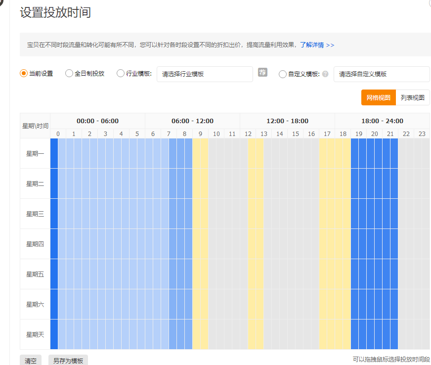 投放时间初期建议选择行业模板,系统会自动帮你设置好每个时间段的时间折扣,不同的颜色的竖条格代表不同的折扣,具体的鼠标点一下就知道了